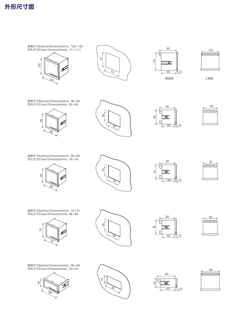 外形尺寸(mm)面框尺寸120×120;96×96;80×80;72×72